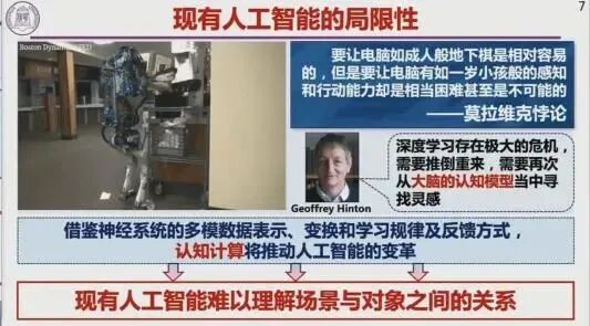 还有一个经典案例——莫拉维克悖论。这台波士顿动力的机器人能翻跟头、跳舞和干很多复杂的事,但让它把一个物体放到有障碍物的桌子上去,它做不到,这就是人工智能的问题所在——难以理解场景与对象间的关系,人工智能能干成年人干的活,但理解能力不如一岁的孩子。